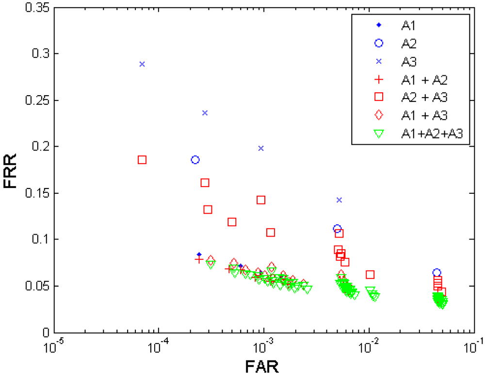Note that the argument that decision level fusion can improve the biometric performance does not always hold but strongly depends on the assumption of independence and marginal performance gap among the elements for fusion [25]. For example, using the fusion rule OR will increase the False Acceptance Rate (FAR) and at the same time decrease the False Rejection Rate (FRR); and using the fusion rule AND will have the opposite effect [this is easier to see from the Equations (1–4) in Section 3.3 under the case that the two elements for fusion are independent]. It is not necessary in theory that we can always obtain improve biometric performance through decision level fusion. The major factor is the performance gap between the two fusion elements. The fusion result could be worse than the one resulted from using the stronger element alone if the performance gap is distinct [25]. Another factor is the independence between the two elements for fusion–obviously dependency among fusion elements will reduce the information difference that can be exploited for performance improvement.