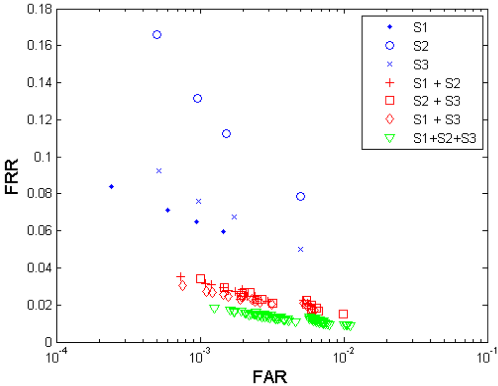 Figure 5 shows both the biometric performance without fusion and the performance with the multi-sensor fusion from the three sensors S1, S2, and S3. Table 5 shows the performances which are closest to the target (FRR ≤ 1%, FAR = 0.1%) when fusing the three sensors.