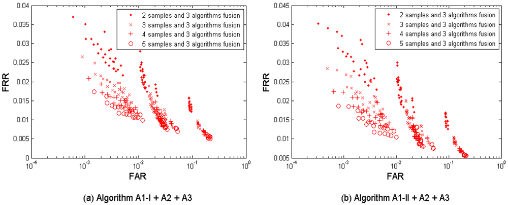 Figure 7(a-b) shows the multi-sample-algorithm fusion results from the three algorithms {A1-I, A2, A3} and {A1-II, A2, A3} respectively, with fusing M = 2, 3, 4, and 5 samples. Table 7 shows the performances which are closest to the target (FRR ≤ 1%, FAR = 0.1%) when fusing the three algorithms. Since each algorithm provides four performance points, the three algorithms result in 4 × 4 × 4 = 64 performance points. It is observed that the performance can be improved by increasing the number of samples used for fusion. This fusion test resulted in better performance than its single-layer fusion scenario (1) multi-sample and (2) multi-algorithm. But its performance point (FRR = 0.0222, FAR = 0.0010, while M = 4) closest to the target has not reached the target yet.