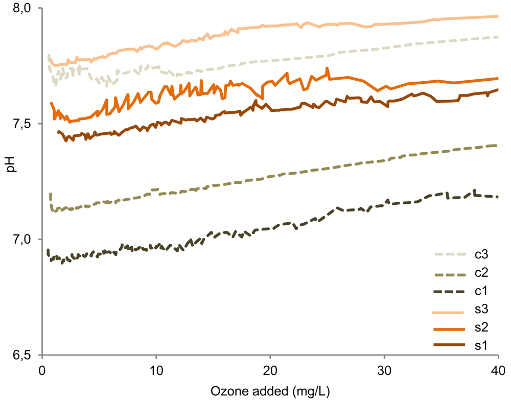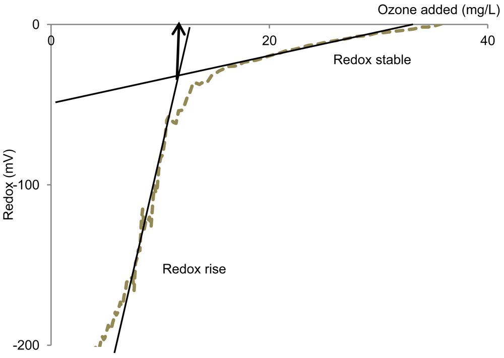 The amount of ozone required to minimize H2S emissions was calculated as the intercept of the linear regression for two of the observed redox phases: the redox rise and the final stable redox phase (Figure 1). The ozone amounts were compared by applying Student's t-test (2-sided, α = 0.05).