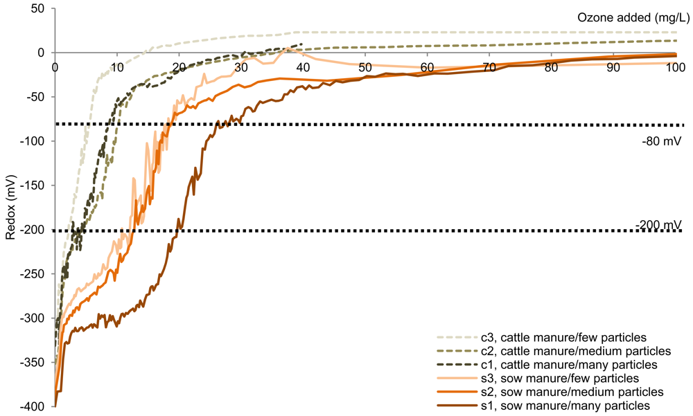 A relatively rapid rise in redox potential was observed approximately from −275 mV to −10 mV (Figure 2). Although the specific redox potential profiles varied, all exhibited as a minimum a rapid rise from −200 mV to −80 mV. Hence, similar reactions occur in the manure samples. The amount of ozone enriched oxygen added during this rise differed between the six manure batches. The redox potential increase was followed by a phase with relatively constant redox potential, which was observed to continue until the experimental maximum additions, i.e., up to 350 mg O3/L manure.