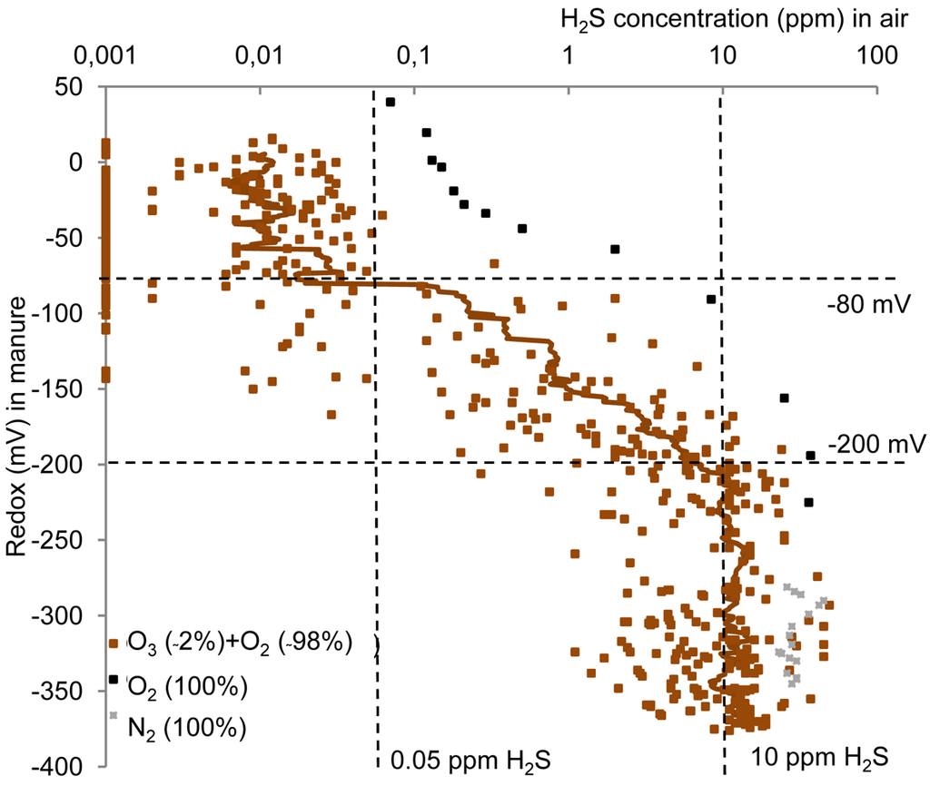 The oxidation curves (amount of oxidizing agent vs. redox potential) of the tested animal manures exhibited similar rises in redox potential upon addition of ozone enriched oxygen. A rapid increase in redox potential was observed at −200 mV to −80 mV. Simultaneously, the concentration of H2S above the manure decreased by 99.5%. The H2S removal was caused by ozone and oxygen oxidation.