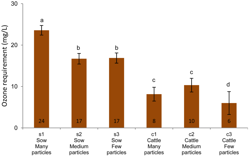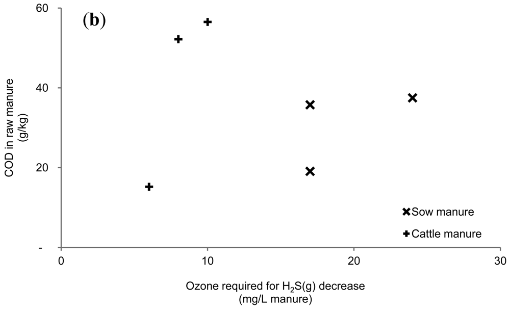 The calculated lifetime of ozone upon reaction with carboxylic acids, 4-methylphenol, other phenols and anions of phenols are high compared to the lifetime upon reaction with HS– (Table 2). Hence, the main ozone consumption is not indicated to be caused by dissolved organic compounds. No relationship between ozone requirement and dry matter content or total chemical oxygen demand (COD) was observed (Figure 5(a), Table 1, Figure 4). Neither were dry matter and total COD entirely responsible for the ozone requirements within the manure types. This is in agreement with previous studies, in which only weak correlations were found between dry matter content and the oxidation level [23,24] and corroborates that ozone predominantly is consumed by H2S/HS− as long as it is present.