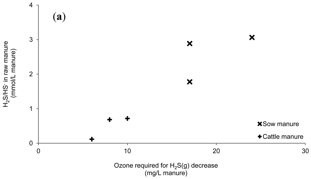 For the six manure batches in this study, the required amount of ozone is estimated to be 6–24 mg O3/L manure (Figure 4). In previous studies of manure, amounts of 250–3,000 mg O3/L have been added to eliminate emissions of odorous compounds by ozonation [1,8,11,12]. These studies focused on compounds other than H2S, but the present study demonstrates that if the main objective of oxidation is to eliminate H2S emissions instantaneously, much lower doses can be used when applied with proper process control.