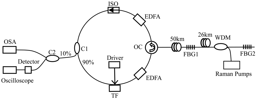 The length, insert loss, zero dispersion wavelength, and dispersion slope of the DSF are about 11.5 km, 3 dB, 1,549 nm, and 0.085 ps/km/nm2, respectively. The 3-dB bandwidth of the electrically tunable filter with an operation wavelength range from 1,520 nm to 1,570 nm is 0.1 nm. A programmable function generator (HM8130) is used as a driver of the tunable filter. A C-band erbium-doped fiber amplifier (EDFA) is used to amplify the output of the FDML fiber laser. Two FBGs with central wavelengths of 1,548.9 nm and 1,546.6 nm, and reflectivity of 96.8% and 95.2% (for FBG1 and FBG2, respectively) are used as sensors. Two 3-dB optical couplers (OC2 and OC3) are used to ensure the measurement of the output of the FDML fiber laser and the sensing signal. An optical spectrum analyzer (OSA1 or OSA2, AQ6317) is used to measure the optical spectra of laser output and sensing signal. A lightwave detector (HP83440D) and an oscilloscope (DSO6052A) are used to measure the sensing signal in time domain.