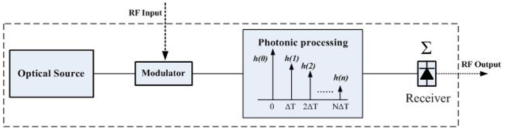 A microwave photonic filter is a photonic subsystem that performs filtering functions at microwave frequencies. The scheme of a typical microwave photonic filter is shown in Figure 11. The microwave signal to be processed modulates the optical signal from the optical source via an optical modulator (it can be a Mach-Zehnder modulator, phase modulator or electro-absorption modulator), and then launches it into the photonic link composed of photonic devices, e.g., wavelength selective elements, attenuators, amplifier, fiber Bragg gratings and delay lines etc., which can perform various functions like tapping, light weighting, and time delays and so on in the optical domain. Then the signal after photonic processing is sent to the receiver (photo-detector) to obtain the processed microwave signals.