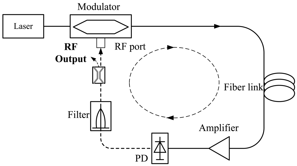 Another category for microwave signal generation is the optoelectronic microwave oscillator [64–68], by which microwave signals with much purer spectrum and higher quality can be generated, and the generating schematic diagram is shown as Figure 13. The only limitation of this generation technique is the bandwidth of the modulator and the electronic filters.