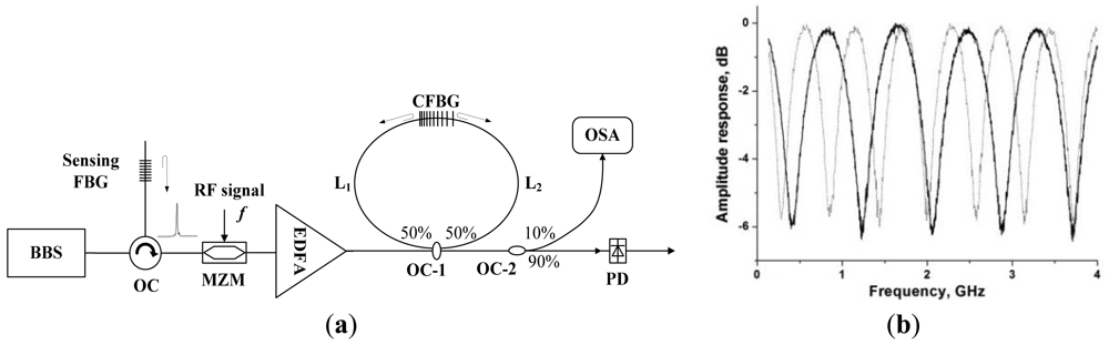 We have proposed a FBG sensing interrogation system using Sagnac loop-based microwave photonic filtering [69], whose experimental setup is shown in Figure 15(a). The output of this structure is a typical response of microwave photonic notch filter, whose frequency response can be expressed as: