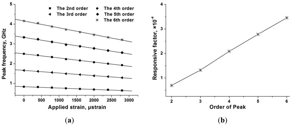 One can also track the peak frequency for sensing interrogation. The measured relationship between the frequency of different order peaks and the applied strain can be illustrated in Figure 17(a), which shows that the sensing responsivity of the system is higher when we track a higher order peak. The measured relationship between the sensing responsivity and the peak order is shown in Figure 17(b).