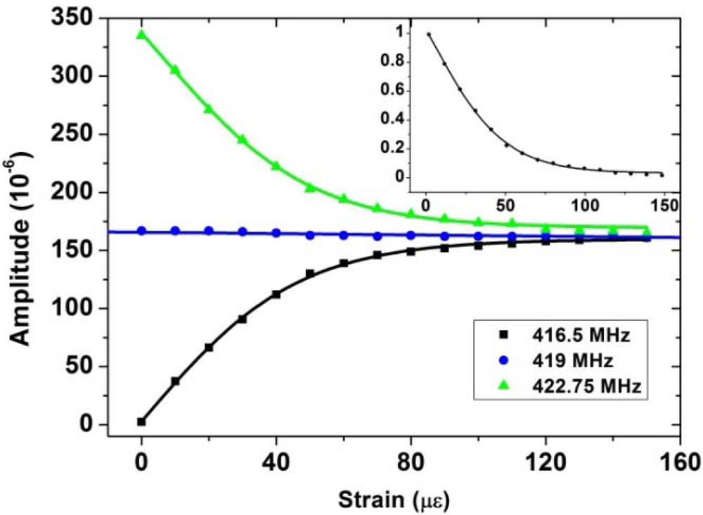 The measured RF signal amplitudes changes with the applied strain at 416.5 MHz (a dip frequency), 419 MHz and 422.75 MHz (a peak frequency) are shown in Figure 20. The slopes of the amplitude changes at dip and peak frequencies for the first 10 με of the applied strain are 3.5 μ/με and 3.2 μ/με, respectively. A small change (less than 0.1 με) in strain can be detected. One can utilize the normalized peak-dip amplitude difference expressed in Equation (6) to measure the strain of the sensing FBG: