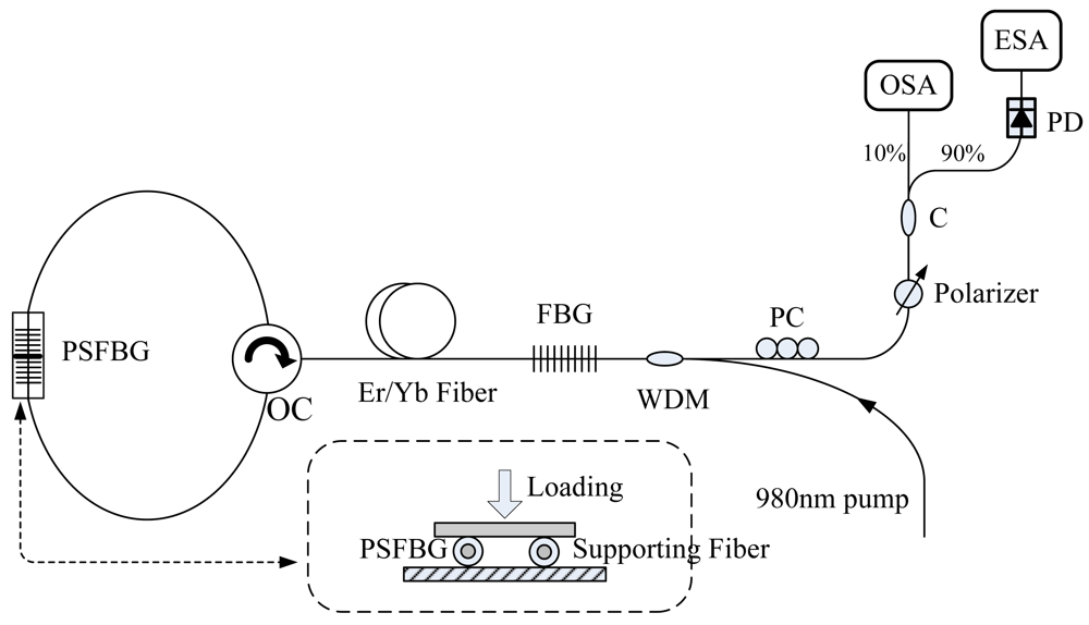 In this configuration, the orientation of the applied transversal loading on the PSFBG is an important factor for the beat frequency of the microwave signals, i.e., the frequency of the beating-generated microwave signal can be different, even the same value of loading is applied, only because the loading applied to the different orientation of PSFBG, so the sensitivity of this sensor can be tailored for different usages. Furthermore, since the beating frequency of this scheme only relies on the wavelength spacing of two narrow transmission peaks of the PSFBG with applied different transversal loading, therefore it is insensitive to the temperature.