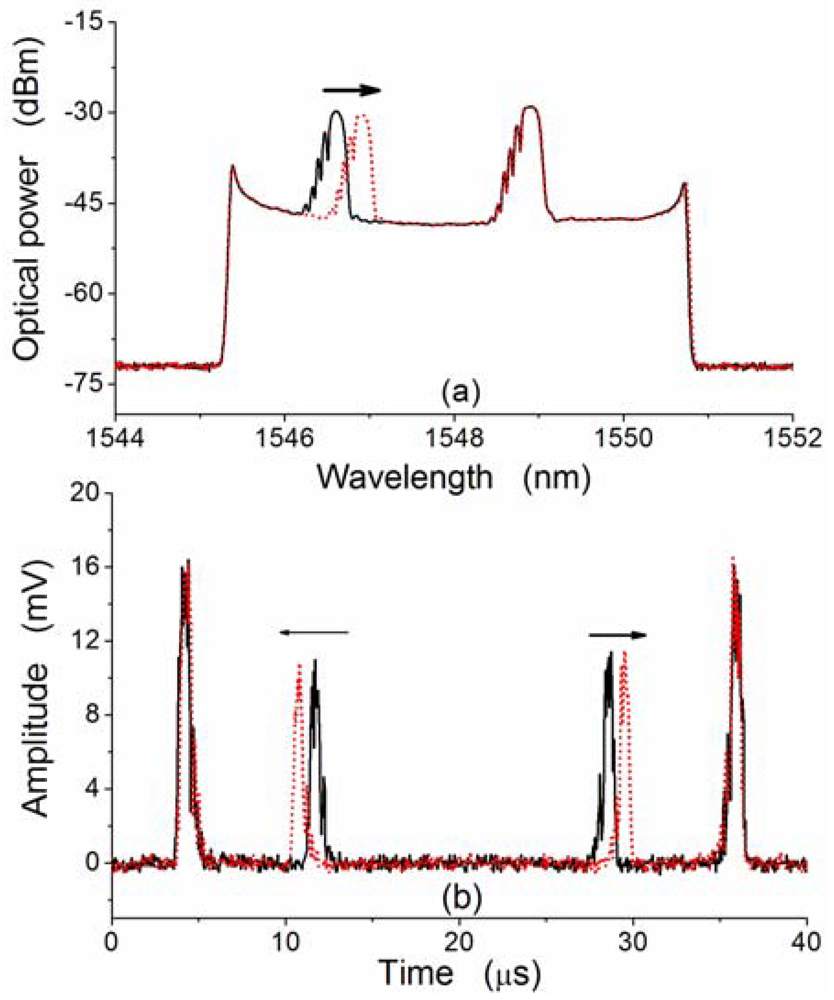 This novel SL-FDML fiber offers an efficient mothed method for the interrogation of multiple FBGs. Figure 9(a) shows the experimentally measured optical spectrum and Figure 9(b) depicts the corresponding time-domain spectrum (b) of the SL-FDML fiber laser containing FBG2 and FBG3 when FBG3 is tuned under strain.The ratio between the time shift of the pulses and the shift of the center wavelength of FBG3 is about 0.55 μs/nm, andis dependent on the original wavelength of the FBG, the scanning range and driving frequency of the tunable filter. Note that the ratio will remain a constant for a given driving signal if a triangular wave is used to drive the tunable filter.