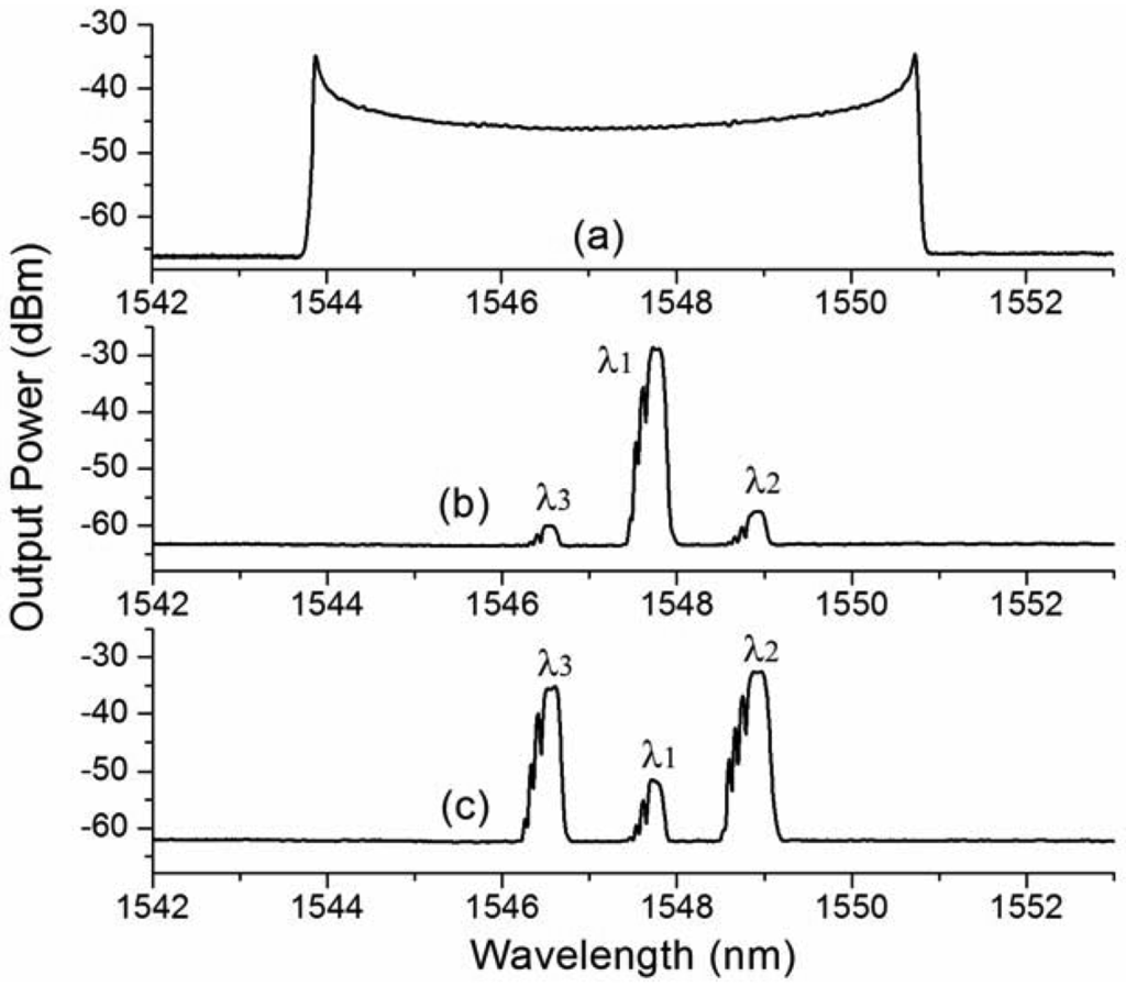 The programmable function generator with sinusoidal waveform output is used to drive the tunable filter in our experiment. When the frequency of the driver signal is adjusted to be 19.464 kHz, 38.921 kHz, and 58.366 kHz, respectively, FDML operations of the fiber laser are achieved. Note that the frequency of the driver signal is only limited by the mechanical response of the tunable filter. Figure 4 shows the optical spectrum of the amplified output of the fiber laser when the frequency, the bias voltage, and the amplitude of the driver signal are 19.464 kHz, 1.0 V, and 730 mV, respectively. The output spectrum width and the central wavelength are dominated by the amplitude (∼7.5 nm/V) and the bias voltage of the dirver signal, which indicates the the number of the FBG sensors in this system is only limited by the gain band of the SOA and the operation wavelength range of the tunable filter. Since the central wavelength has not been tuned outside the gain band of the SOA, the output of the FDML fiber is continuous wave with different wavelength at different time.