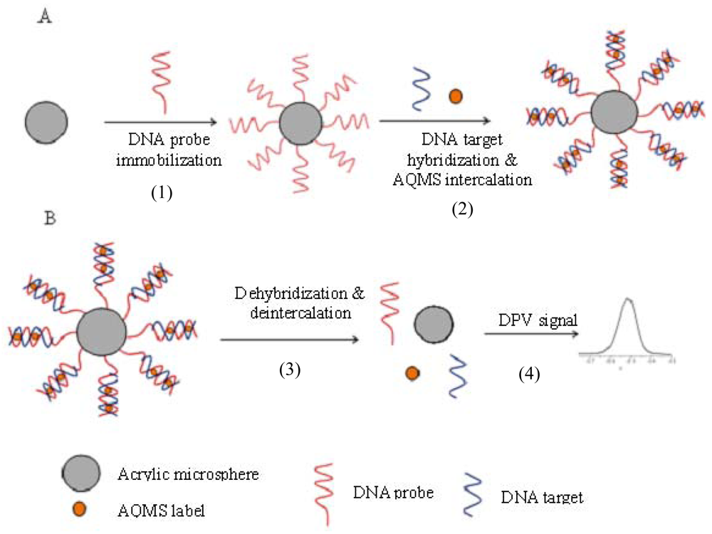 An electrochemical microbiosensor for DNA has been fabricated based on new acrylic microspheres modified with reactive N-acryloxysuccinimide (NAS) functional groups. Hydrophobic poly(n-butylacrylate-N-acryloxysuccinimide) microspheres were synthesized in an emulsion form with a simple one-step photopolymerization technique. Aminated DNA probe was attached to the succinimde functional group of the acrylic microspheres via covalent bonding. The hybridization of the immobilized DNA probe with the complementary DNA was studied by differential pulse voltametry using anthraquninone-2-sulfonic acid monohydrate sodium salt (AQMS) as the electroactive hybridization label. The influences of many factors such as duration of DNA probe immobilization and hybridization, pH, type of ions, buffer concentrations, ionic strength, operational temperature and non-complementary DNA on the biosensor performance were evaluated. Under optimized conditions, the DNA microbiosensor demonstrated a linear response range to target DNA over a wide concentration range of 1.0 × 10−16 and 1.0 × 10−8 M with a lower limit of detection (LOD) of 9.46 × 10−17 M (R2 = 0.97). This DNA microbiosensor showed good reproducibility with 2.84% RSD (relative standard deviation) (n = 3). Application of the NAS-modified acrylic microspheres in the construction of DNA microbiosensor had improved the overall analytical performance of the resultant DNA microbiosensor when compared with other reported DNA biosensors using other nano-materials for membranes and microspheres as DNA immobilization matrices.1. Introduction
