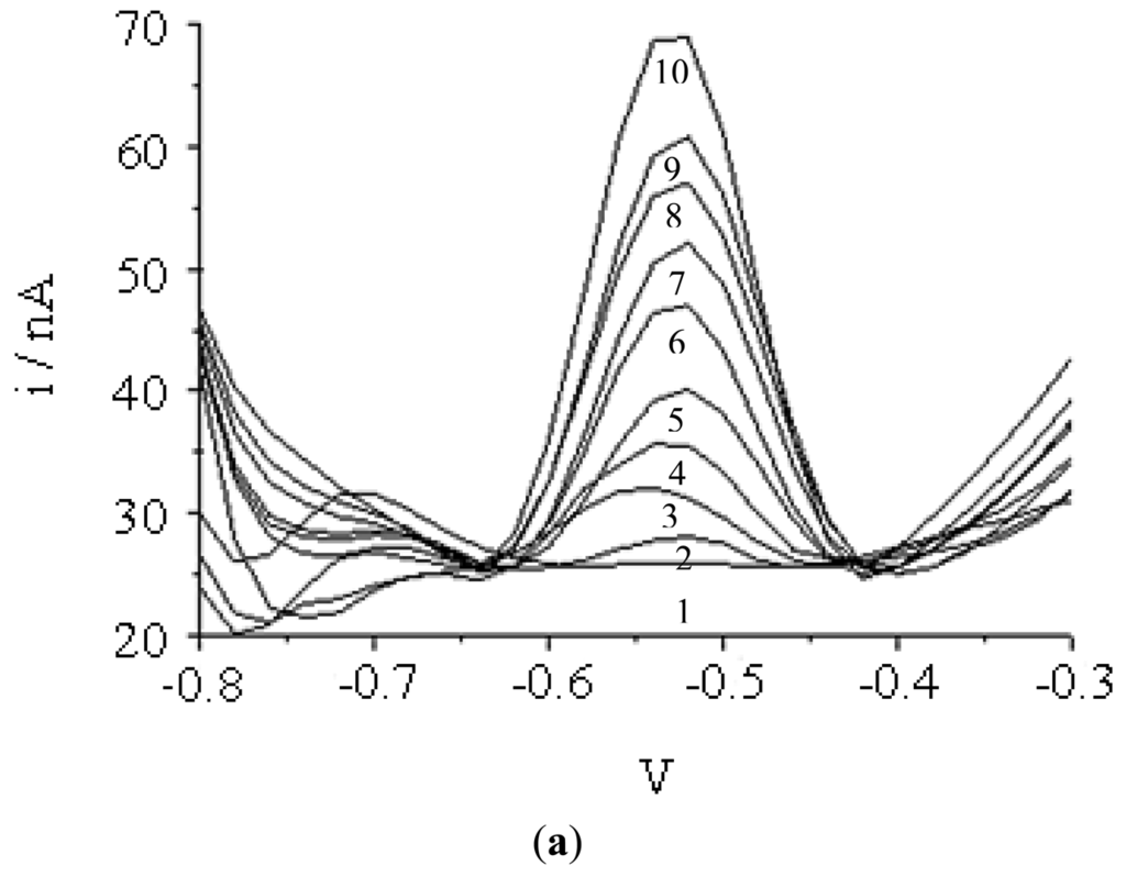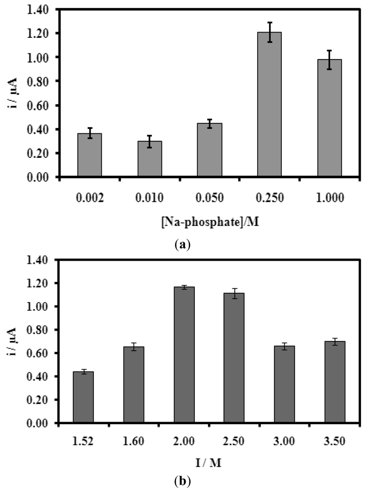 In Figure 7(a,b), both Na-phosphate buffer (pH fixed at 7.5) concentration and ionic strength have effect on the biosensor response. In both cases, there is an optimum value where the biosensor gave the highest current response or the highest degree of hybridization. Thus, 0.25 M Na-phosphate buffer (pH 7.5) and 2.0 M ionic strength (from NaCl) were found to be optimum for the biosensor response. This may be explained by at certain amount of ionic content of the solution, the electrostatic repulsion between DNA molecules decreases and thus improving the DNA hybridization reaction. In the presence of too low or too high ionic content, the presence of electrostatic repulsion becomes dominant and the hybridization of DNA molecules become difficult [46].