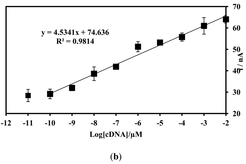Figure 10 demonstrates the effect of different complementary DNA concentrations on the biosensor response. The current response increases with increasing DNA concentrations indicates more DNA hybridization. This current response was linear towards the DNA concentration from 1.0 × 10−16 and 1.0 × 10−8 M with a LOD of 9.46 × 10−17 M. Using two DNA concentrations of 1.0 × 10−13 M and 1.0 × 10−10 M, the DNA microbiosensor yielded a good reproducibility with the RSD value of 2.86% (n = 3). The performance of the DNA microbiosensor based on NAS-modified acrylic microspheres yielded a wider linear response range and lower detection limit when compared with a DNA microbiosensor employing the same sequence of DNA probes self-assembled on a mercaptol modified gold electrode, which yielded a linear response range from 5.0 × 10−10 to 1.0 × 10−6 M with detection limit at 10−12 M level [37].