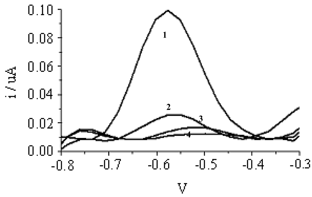 Figure 3 shows the DPV peak at −0.5 V for AQMS that has been intercalated into DNA probe immobilized on poly(nBA-NAS) microspheres after hybridization with complementary DNA. However, the current at peak −0.5V was small and non-observable for events that did not involved hybridization such as in the presence of non-complementary DNA, in the absence of DNA and blank microspheres (no immobilised DNA probes; Experiments 2–4). The higher current response observed for Experiment 1 compared with Experiment 2, i.e., when non-complementary DNA was introduced, indicated that the immobilized DNA probe was selective towards complementary DNA and it was indicated by AQMS intercalation into dsDNA formed as has been previously reported [3,38–40]. Control Experiments 3 and 4 were also performed to determine whether any non-specific adsorption of AQMS on ds-DNA probe or blank acrylic microsphere. The relatively small currents observed in Experiments 3 and 4 compared with Experiment 1 implied that the non-specific adsorption of AQMS was negligible. The slight adsorption of AQMS onto DNA probe (ssDNA) was consistent with observation previously reported [41]. The highest current observed for the complementary DNA (Experiment 1) thus indicated hybrization where intercalation of AQMS had occurred in dsDNA formed on the microsphere surface.