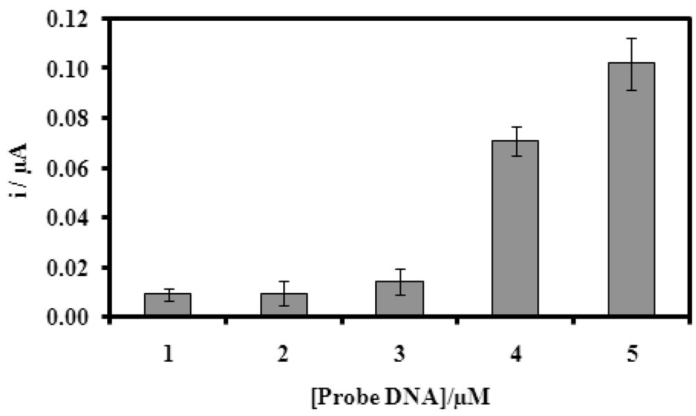 Figure 4 represents the DNA microbiosensor response with various concentrations of DNA probe immobilized onto the acrylic microspheres after hybridization with complementary DNA and followed by intercalation of AQMS. DNA microbiosensor response increased proportionally with increasing concentration of DNA probe immobilised. This suggests that the capacity of immobilized DNA probe to hybridize with complementary DNA has increased with an increase in DNA probe attached onto the acrylic microspheres. The dependence of DNA hybridization on DNA probe concentration has also been reported previously [15,42,43].