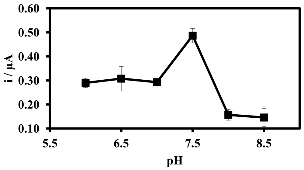 Figure 5 illustrates the pH effect on DNA hybridization response of the biosensor. The DPV current increased abruptly at pH 7.5, after which a sharp decline in current response was observed under more alkaline conditions. The increased response of the DNA microbiosensor at pH 7.5 indicates that more DNA probes were hybridized with complementary DNA at this pH. Previous studies [44] have reported that the rate of DNA hybridization reaction can be influenced by the pH of the solution. At a more acidic environment, the protonation reaction of the phosphodieter of the DNA can reduce the solubility of the DNA molecule, which eventually decreases the DNA hybridization [3]. Under a more basic medium, DNA hybridization also decreased and hence the response of DNA biosensor was also lower [45]. Therefore, the optimize pH of DNA hybridization was selected at pH 7.5 using Na-phosphate buffer solution for subsequent biosensor studies.