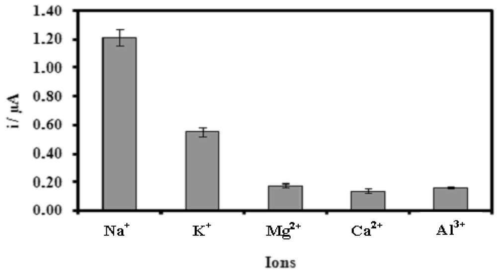 Positively charged ions such as Li+, Na+, K+, and Mg2+ ions can interact with the negatively charge phosphodiester chain of the DNA. This ionic reaction will neutralize the charge of the DNA molecule and thus decreases the electrostatic repulsions between DNA molecules. The absent of electrostatic repulsion eases the DNA hybridization reaction [46–48]. Figure 6 depicts the effect of some cations on the DNA hybridization reaction of the biosensor. The DNA hybridization reaction rate increased in the present of positively charged ion in the order of Na+ > K+ > Al3+≈Ca2+≈Mg2+. The presence of Ca2+ and Al3+ ions had reduced the DNA hybridization compared with that of Na+ and K+ ions because the ionic interactions of Ca2+ and Al3+ ions with phosphate ions from the buffer lead to formation of insoluble phosphate compounds. Thus, this reduces the ionic content of the medium and increases the electrostatic repulsion between DNA molecules. Under such conditions, hybridization is more difficult to achieve and the biosensor response declined. The higher DNA hybridization current as indicated by the biosensor response in the presence of Na+ ion was due to the smaller size and stronger affinity of Na+ ion towards DNA phosphodieter chain to reduce the electrostatic repulsion between DNA molecules as compared with K+ and Mg2+ ions. As the use of Na+ ion demonstrated better biosensor signal than K+, Mg2+, Ca2+ and Al3+ ions, therefore Na+ ion was used in further DNA biosensor studies based on modified acrylic microspheres.