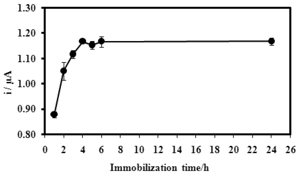 For the duration of immobilisation, the microbiosensor response showed a current increase from 1.0–4.0 h of immobilisation time, after which there was no obvious change in the current measured (Figure 8). Longer immobilization times resulted in the higher amount of DNA probes immobilized onto the microspheres. After 4.0 h of exposure to the DNA probes, the active sites of microspheres are presumably fully attached with DNA probes.