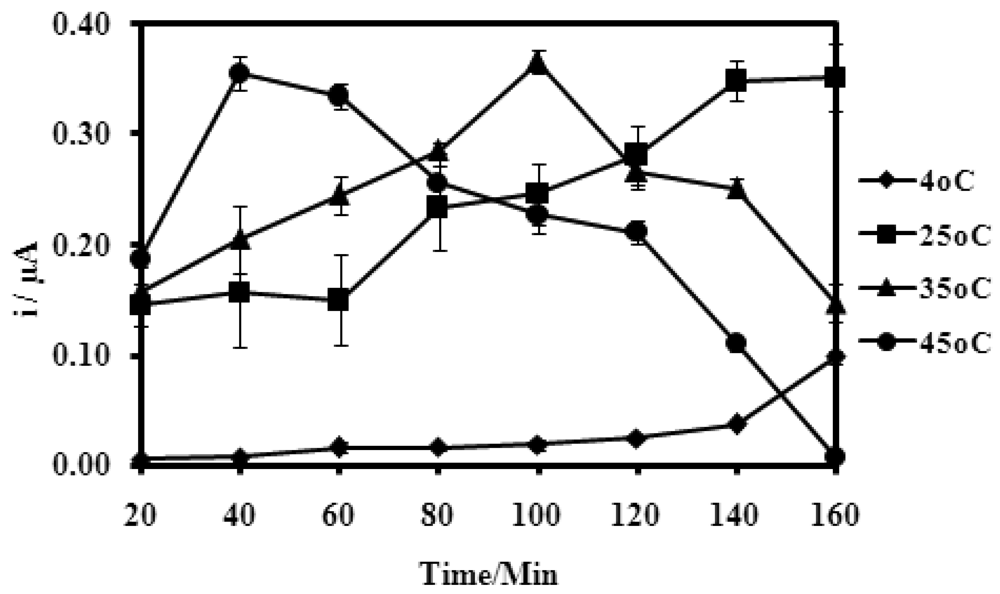 Temperatures appear to affect the time taken for the maximum DPV current response of the microbiosensor. When temperatures were raised from 4 °C and 45 °C, the time taken for maximum DNA hybridization reduces to just about 40 min at 45 °C (Figure 9).