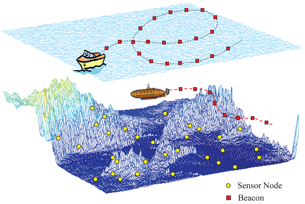 For a long time, there has been significant interest in monitoring underwater environments to collect oceanographic data and to explore underwater resources. These harsh underwater environments have limited human access and most of them remain poorly understood. Recent advances in hardware and network technology had enabled sensor networks capable of sensing, data processing, and communication. A collection of sensor nodes, which have a limited sensing region, processing power, and energy, can be randomly deployed and connected to form a network in order to monitor a wide area. Sensor networks are particularly promising for use in underwater environments where access is difficult [1–3]. In underwater acoustic sensor networks (UASN), localization of sensor nodes is essential because it is difficult to accurately deploy sensor nodes to predetermined locations. In addition, all the information collected by sensor nodes may be useless unless the location of each sensor node is known [4].