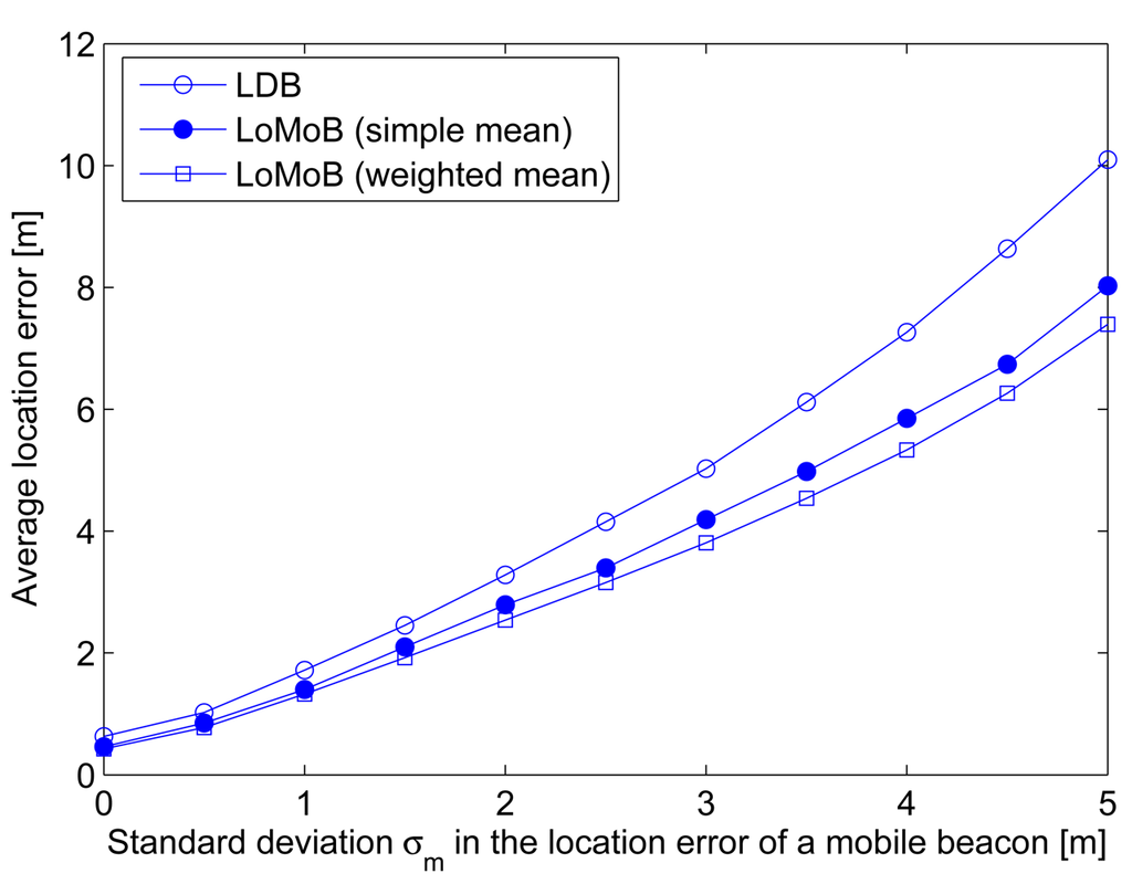 A mobile beacon is generally assumed to know its own location. In reality, the location information of a mobile beacon may be erroneous. As well as irregularities in the radius of the circle formed by the transceiver's beam, the location error of a mobile beacon needs to be considered because this also causes erroneous estimation of the distances between the projected beacon points and a sensor node. Figure 9(a) compares the average location error according to the standard deviation σm in the location error of a mobile beacon and Figure 9(b) compares the ratio of localized sensor nodes with location errors below 10 m. LoMoB improves the average location error by 21.5%–32.4% compared to LDB. The ratios of localized sensor nodes show a maximum difference of 4.3%. In addition, Figure 10 shows the average location error of LDB and LoMoB applying a simple mean and the weighted mean; if all the weights are equal, then the weighted mean is the same as the simple mean. LoMoB applying a simple mean and the weighted mean improves the average location error by 14.3%–26.9% and 21.5%–32.4%, respectively. This indicates that the use of all the potential locations in LoMoB is the main factor to improve LDB and the use of the weights results in additional increase in the localization accuracy.