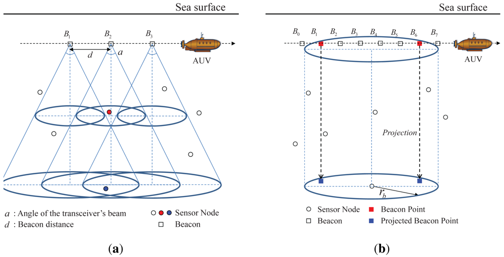 In LDB, an AUV with a directional transceiver moves at a fixed depth in water and broadcasts its location, which called a beacon, and the angle of its transceiver's beam (a) at regular intervals, called beacon distance (d), as shown in Figure 2(a). When the AUV sends a beacon, the sensor nodes that fall in the conical beam receive the beacon; e.g., in Figure 2(a), the sensor node in red can receive the beacon B2 and the sensor node in blue can receive the beacons B1, B2, and B3. The conical beam forms circles with different radii according to the depth of the sensor nodes, as shown in Figure 2(a). When the z coordinates of the AUV and a sensor node are zA and zs and the angle of the transceiver's beam is a, the radius of the circle formed by the beam for the sensor node is given as follows: