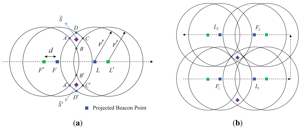 Four circles are then drawn with radius rb centered at the four points F′, F, L, and L′. Because the sensor node should be located outside the circles centered at F′ and L′ and inside the circles centered at F and L, the intersection areas ABCD and A′B′C′D′ represent possible locations of the sensor node. One of the two points, S̃ and S̃′, within the two areas will be estimated as the location of the sensor node. Here, S̃ is the midpoint of B and D and S̃′ is the midpoint of B′ and D′. When just one projected first-heard beacon point and one projected last-heard beacon point are used, two possible node locations are found. The choice between the two points S̃ and S̃′ can be made after an additional two beacon points are obtained, as shown in Figure 3(b). In LDB, the first two beacon points are used to compute two possible points for the location of a sensor node based on geometric constraints and the next two beacon points are used for the choice between the two possible points.