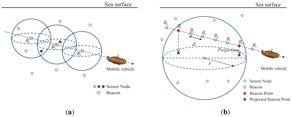 A mobile beacon moves on the sea surface or underwater. When a mobile beacon has an omnidirectional transceiver, 3D movement of the mobile beacon is possible whereas a mobile beacon that has a directional transceiver is restricted to 2D movement at a fixed depth. The mobile beacon is assumed to know its own location and to broadcast a beacon containing its location information at regular distance intervals, which are called the beacon distance d. When the mobile beacon transmits a beacon, the sensor nodes that are located within the communication range of the mobile beacon receive the beacon; e.g., in Figure 4(a), the sensor node in red can receive the beacon B2 and the sensor node in blue can receive the beacons B1 and B2. Here, the communication range r is assumed to be constant in 3D [11,12,20]. In addition, because movement of a mobile beacon in a straight line is more controllable than curved movement, the mobile beacon is assumed to follow the random waypoint (RWP) model [21]; the mobile beacon moves in a series of straight paths to random destinations.