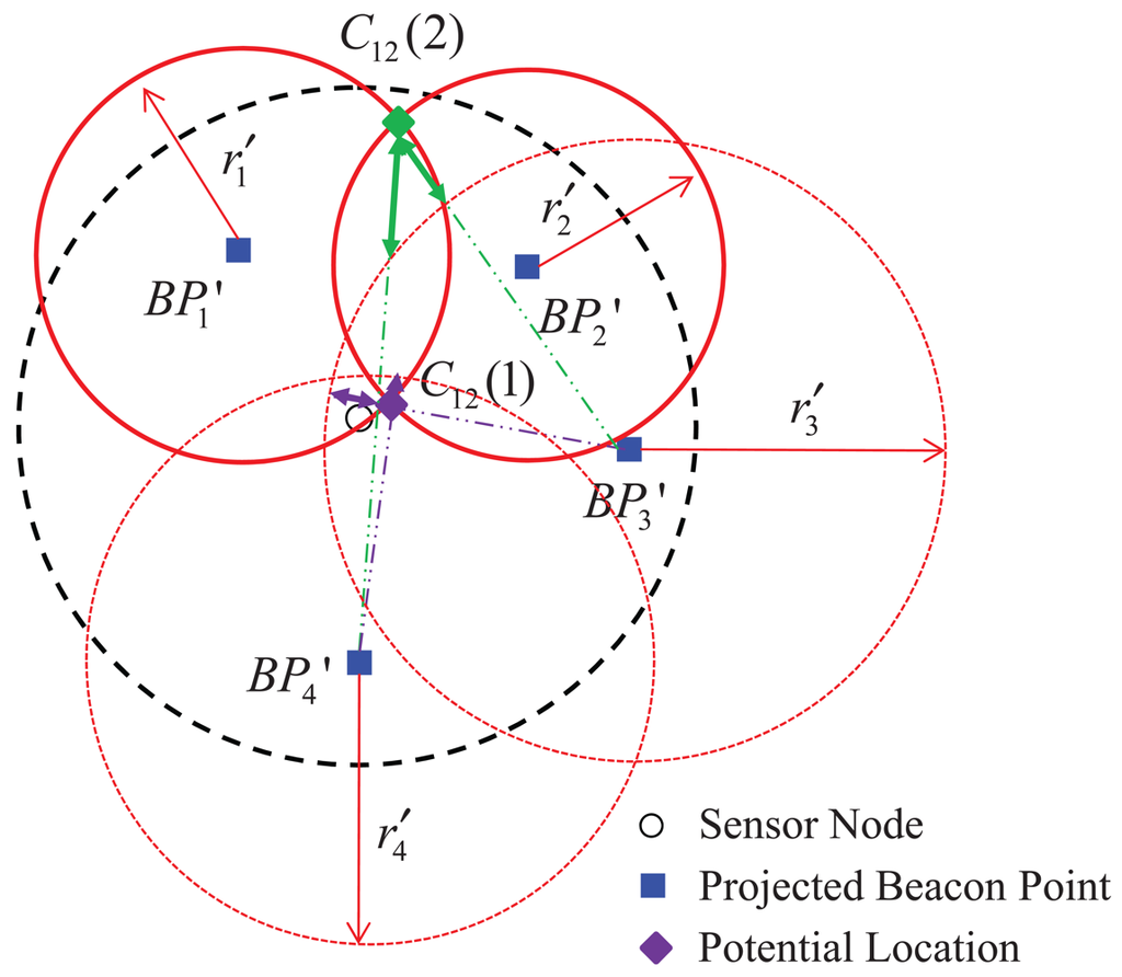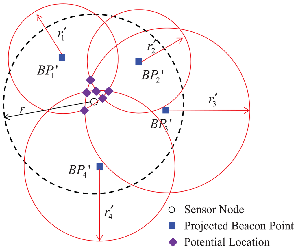 In this subsection, we explain how to estimate the location of a sensor node based on the distances between the sensor node and the projected beacon points. First, potential locations are obtained as candidates for the location of the sensor node. Second, the location of the sensor node is estimated using the weighted mean of the potential locations.