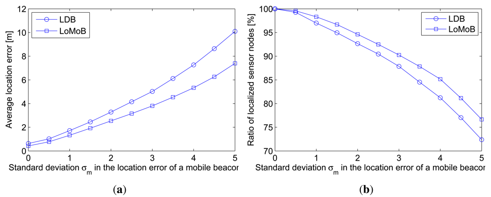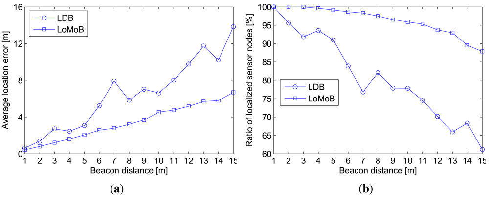 Figure 7(a) compares the average location error as a function of the beacon distance and Figure 7(b) compares the ratio of localized sensor nodes with location errors below 10 m. The average location error of LDB is shown to fluctuate more and to be larger than that of LoMoB. As the beacon distance increases, the performance gap between LoMoB and LDB tends to widen. Figure 7 demonstrates that LoMoB is less vulnerable to the beacon distance than LDB.