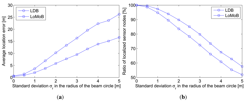 In real underwater environments, the radius of the circle formed by the transceiver's beam is expected to fluctuate. Irregularities in the radius of the circle cause sensor nodes to provide erroneous estimates of distances between the projected beacon points and a sensor node, in addition to the error associated with the beacon distance. Figure 8(a) compares the average location error as a function of the standard deviation σr in the radius of the circle and Figure 8(b) compares the ratio of localized sensor nodes with location errors below 10 m. As shown in the figures, the average location error increases as irregularities in the radius of the circle increase. LoMoB has 32.4%–45.8% smaller location errors than LDB. The ratios of localized sensor nodes show a maximum difference of 7.4%. LoMoB is verified to be more tolerant to irregularities in the radius of the circle formed by the transceiver's beam than LDB.