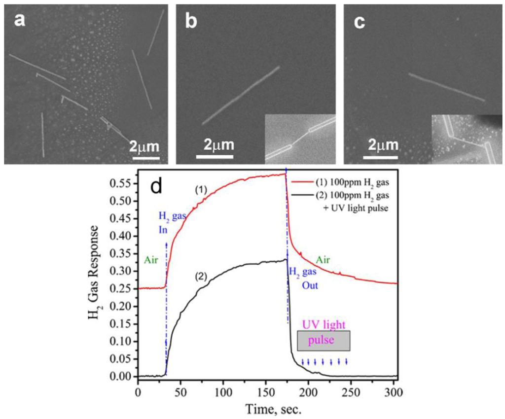 By means of the rapid development of nano-fabrication technique, hydrogen sensors based on individual NWs were fabricated by letting the NW bridging crossover the nano-scale electrodes either through the focused ion beam (FIB), electron beam lithography (EBL) process or by the dielectrophoresis (DEP) controlling. As a result, nearly all these hydrogen sensors are based on the resistance variation with the exposure to hydrogen containing atmosphere. Table 2 lists the sensing performance of recently developed hydrogen sensors based on individual SMO 1D nanostructures.
