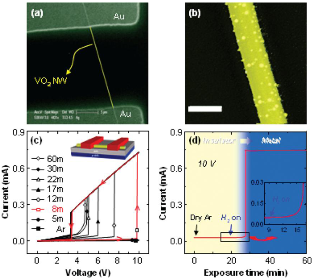 Baik and co-workers have reported a hydrogen sensor based on the metal-insulator transition (MIT) of Pd-sensitized VO2 NW, as shown in Figure 11 [99]. By biasing the NW judiciously so that its temperature is just below the metal-insulator transition temperature, even trace amounts of hydrogen induce the metal-insulator transition, producing an almost three order of magnitude increase in the current through the NW. The authors suggested that the large change in the MIT transition temperature of VO2 may result from the formation of hydrogen interstitials or from the formation of adsorbed OH, which act as electron donors that increase the carrier density in the conduction band. Two processes during hydrogen response were illustrated. During a rapid initial process, the insulator to metal transition temperature is decreased by >10 °C even when exposed to trace amounts of hydrogen gas. Subsequently, hydrogen continues to diffuse into the VO2 for several hours before saturation is achieved with only a modest change in the insulator to metal transition temperature but with a significant increase in the conductivity. The two time scales over which hydrogen-related processes occur in VO2 likely signal the involvement of two distinct mechanisms influencing the electronic structure of the material, one of which involves electron-phonon coupling pursuant to the modification of the vibrational normal modes of the solid by the introduction of H as an impurity.