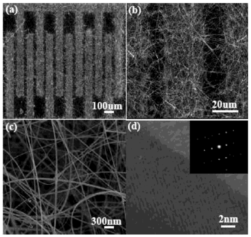 Recently, DEP controlling has been gradually introduced for fabricating individual NW and NW-network based devices. Owing to the small diameter and high aspect ratio, NWs are very easy to control for the alignment between micro- or nano-scale electrodes by adjusting the DEP parameters. Huang et al. have demonstrated a hydrogen sensor based on SnO2 single NR, which is aligned by DEP controlling and fixed by Pt stripes onto the microelectrodes [97]. This sensor shows a fast and selective response to 100 ppm of hydrogen at RT, but shows its best performance at 250 °C. The good sensing performance of the NR sensors can be attributed to the intrinsically small dimensions of the NR, comparable to the depletion layer. Although DEP can be used for fabricating individual NW/NR based sensors, the control accuracy is much lower than with the FIB or EBL processes, therefore, it is mostly used for fabricating NW/NR networks.