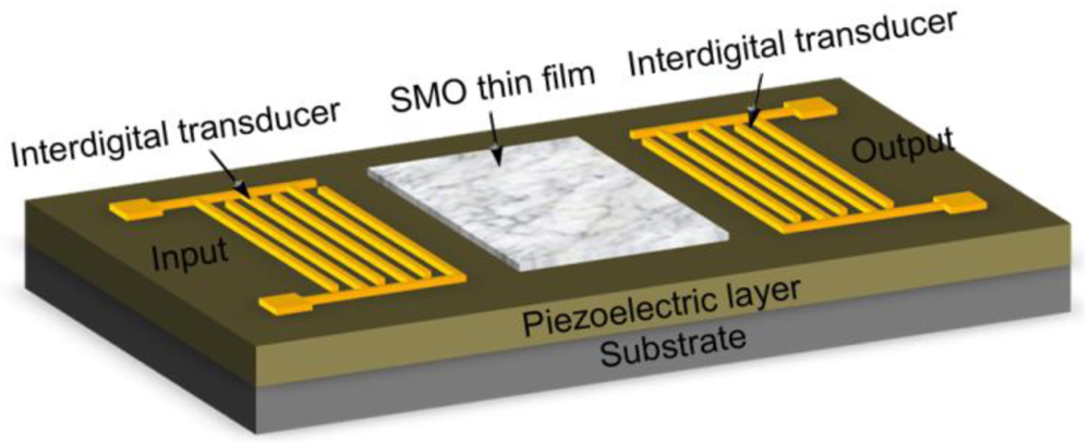 Figure 5 shows a typical structure of a SAW hydrogen sensor. Two interdigitated transducers (IDTs) were deposited on a piezoelectric film. The input IDT converts the applied electrical signal into acoustic waves by the inverse piezoelectric effect. The generated acoustic waves propagate along the surface within 1 or 2 acoustic wavelengths, and are converted back to electrical signals by the output IDT. The acoustic wave is very sensitive to the variation of surface conditions, and therefore can be used in hydrogen sensing when a SMO thin film hydrogen sensing layer is deposited on the surface of the piezoelectric layer between the IDTs. The hydrogen concentration can be detected by the frequency shift tested on the output port of the SAW device. The piezoelectric materials mostly employed for fabricating acoustic wave devices were LiNbO3, LiTaO3 and AlN, etc., while WO3, ZnO and InOx were often used as SMO sensing layer [55–58].
