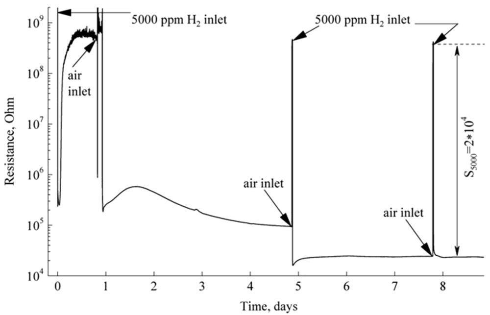 Most of the SMO thin film hydrogen sensors are resistance type ones, which operate based on the variation of conductivity of the SMOs. Table 1 lists the recent studies on the hydrogen sensing performance of the resistance based SMOs. We have made a suitable transformation to these data, especially the sensitivity which were uniformed to be S = R0/Rg. Thus, the sensor responses from other literature in Table 1 are comparable. For instance, Adamyan and co-workers have reported the hydrogen sensing performance of the nanocrystalline SnO2 thin films with high sensitivity derived from a sol-gel annealing process, which is a common method for fabricating nanocrystalline oxide thin films and ensures the high-temperature stability of the nanocrystalline grains [65,66]. They suggested that pulse heating treatment during the sensing process could reduce the influence of environmental humidity, improve the stability and reduce the performance drift. As shown in Figure 6, they also studied the sensor parameters in real time during short- and long-term operation, which is always ignored by researchers. The sensing parameters were improved by a long-term treatment with an increase of sensitivity on more than two orders of magnitude. They attributed the improvement of performance to the diminished oxygen adsorption on defects during subsequent sensor operation in a hydrogen atmosphere. The diminishing oxygen adsorption on defects can reduce the local fields of defects and increase the oxygen adsorption on regular lattice atoms of the surface, which can enhance the hydrogen response. This work has had a great impact on emphasizing the importance of long-term stability of SMOs nanostructure-based hydrogen sensors.