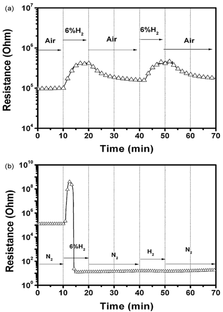 Most SMOs used as hydrogen sensing materials are n-type semiconductors, while CuO and NiO with p-type conduction can also be employed for hydrogen sensing. Hoa et al. synthesized p-type semiconducting CuO thin films by deposition and thermal oxidation of Cu on SiO2 substrates [72]. As reported, the p-type semiconducting property is due to the Cu vacancies in the crystal structure (Cu1−δO) [73]. The CuO thin films showed increased resistance upon exposure to a hydrogen-containing environment. Except for the first intense hydrogen response, however, the sensor showed no response at all after the hydrogen dilution by N2 gas, as shown in Figure 8. This result demonstrated the key role of oxygen adsorbed on the surfaces of the CuO sensor materials, and provided a typical example showing no reaction with hydrogen without mediation via oxygen. Steinebach and co-workers also reported the p-type hydrogen sensing behavior of NiO thin films at elevated temperatures (T > 500 °C) [74]. They found that the gas response of the NiO thin films was correlated to the surface roughness. A highest response could be obtained at the thin film with highest surface roughness due to the high specific surface area offering more surface adsorption site for oxygen from the gas phase. In addition, a tunable gas sensing behavior of ZnO thin films between p-type and n-type were reported by Kobrinsky and co-workers [75]. This work indicates that the exposure to hydrogen gas may invert the sensor between p- and n-type in a fast and reversible manner.