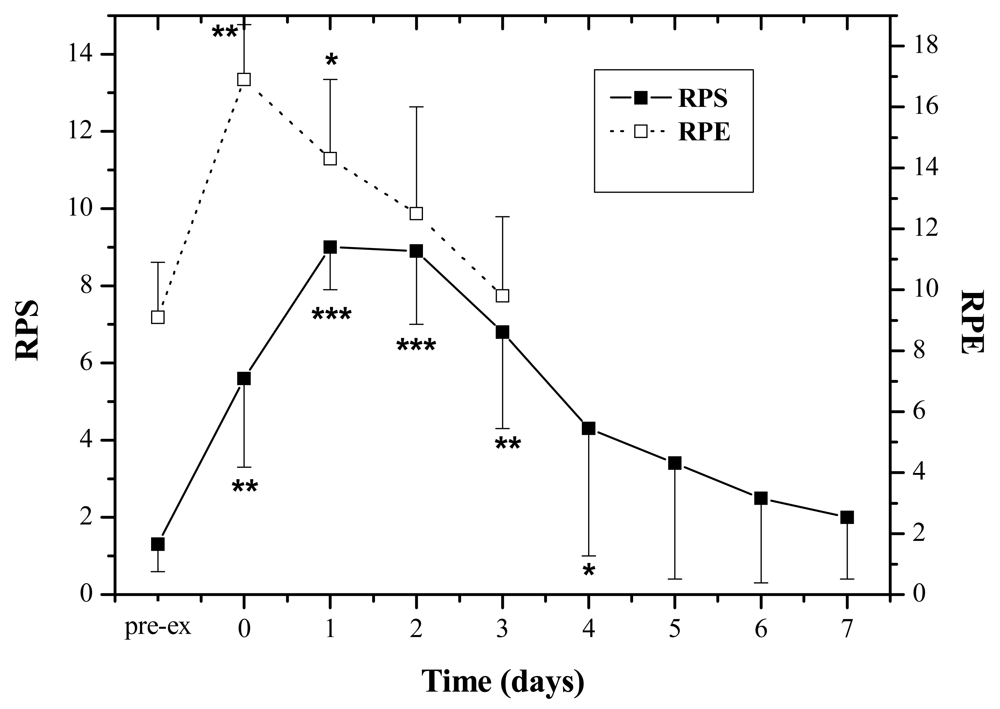 The subjects experienced moderate physical exertion during the exercise as RPE increased significantly after the exercise (Pre: 9.1 ± 1.8; Post: 14.3 ± 2.6, P < 0.01). The muscle soreness revealed by RPS peaked at 24–48 h by comparing with the pre-exercise value (P < 0.001), and attenuated 5 days post-exercise, and finally subsided seven days afterwards (Figure 1).