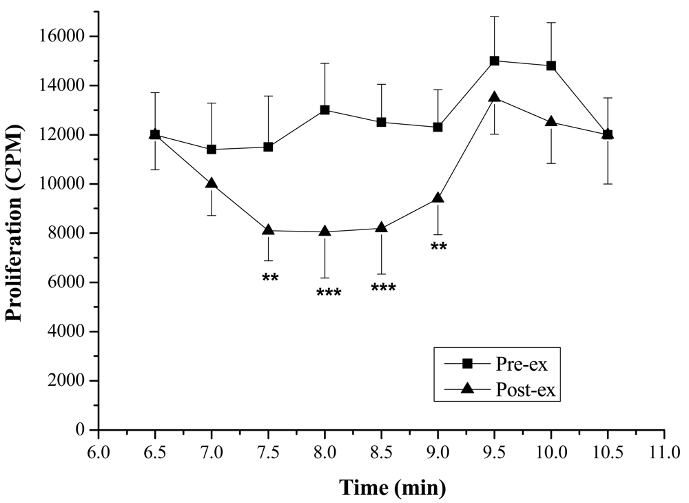 It is known that strenuous exercise induces immunosuppression. Such a response explains partly the increased risk of infection in athletes []. However, it was not clear whether serum immunosuppressive factor(s) would be generated after intense exercise in humans. This study was designed to examine the generation of immunosuppressive factors in response to exercise. Since the model of lymphocyte proliferation induced by Con A in mice has been well established for testing the circulating immunosuppressive polypeptide of humans in clinical situations [], the generation of immunosuppressive factors in humans in response to exercise was revealed by comparing the effects of pre- and post-exercise human serum on the Con A-induced lymphocyte proliferation in the mice model.
