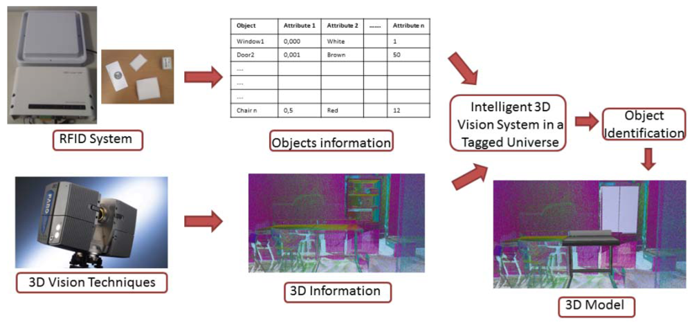 The outline of the proposed system is depicted in Figure 1. The system is based on two technologies connected by a specific integration block. The treatment of 3D information in the scene, represented by the 3D Vision Techniques block, considers both the acquisition and the processing of 3D data. A FARO Photon 80 scanner has been used in this block, and the data obtained from this 3D sensor provides geometric and color information of the scene. Bearing an automatic generation of the model of the scanned scene in mind, it is necessary to recognize the elements that are present in the scanned zone. RFID technology can assists vision technologies in this task by providing relevant information to identify and pose the elements in the scene. The RFID System block represents the treatment of the information stored in the passive RFID tags. An OBID sensor, model LRU 3500 from FEIG Company, connected to an ultra-high frequency (UHF) antenna has been used in this block. This sensor allows information to be read and written on the tags. Both, 3D scanner and RFID system, work together during the scanning process. The RFID reader is onboard the scanner platform. Thus 3D data and tag detection can be obtained at the same time. We denote this system in Figure 1 as “Intelligent 3D Vision System in a Tagged Universe”, in which data from the two sensors is used to identify elements and to reconstruct the 3D model of the scenario.