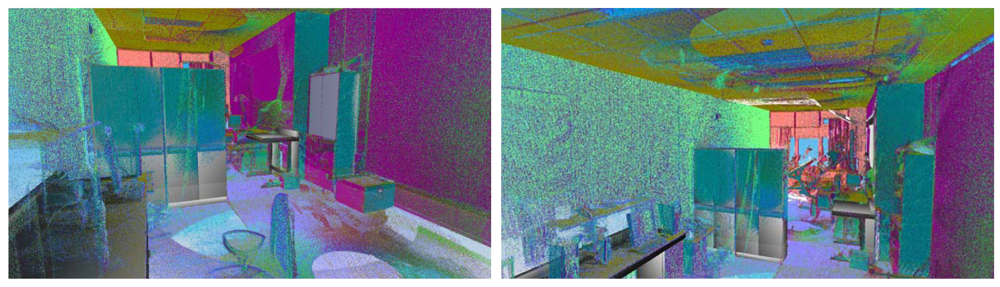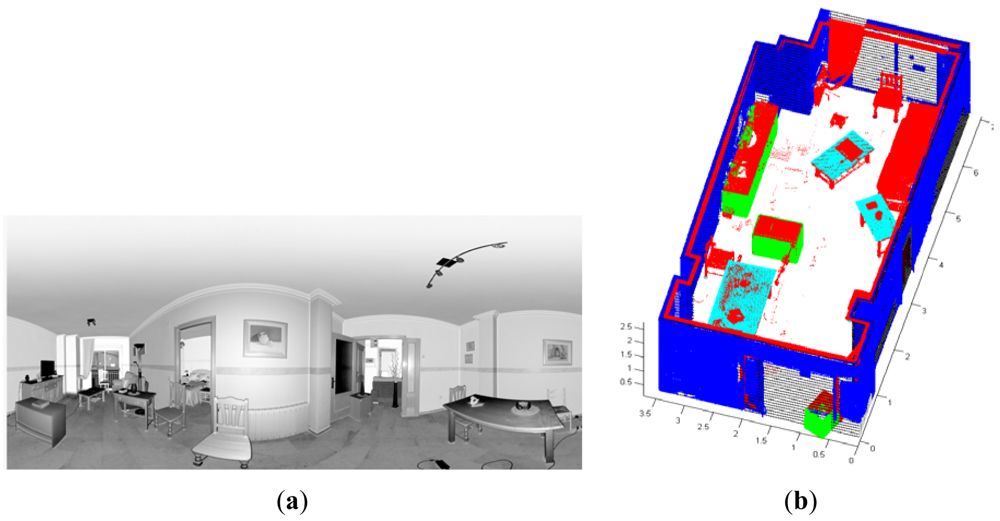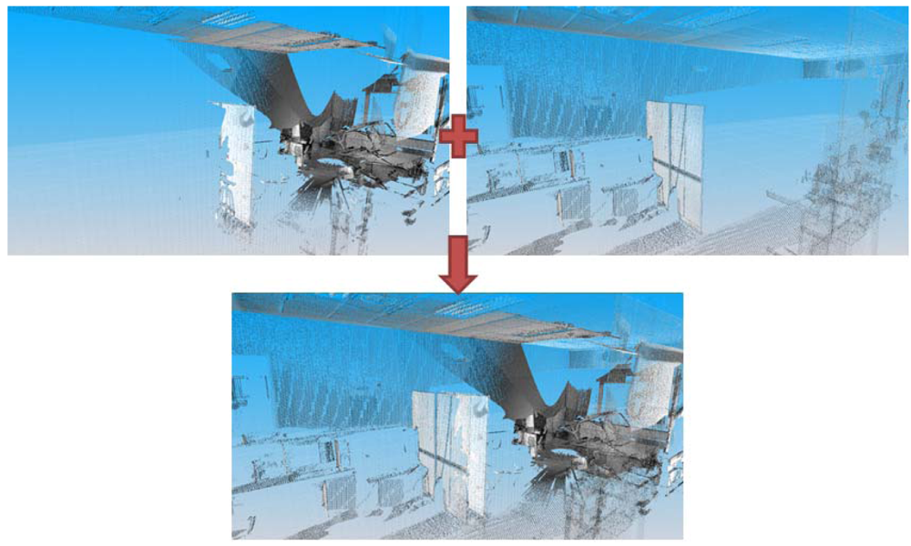 3D information of the environment is obtained by virtualizing the scenario by means of the laser scanner sensor mentioned in the previous section. Its field of vision allows it to be employed in scenes under study up to 80 m. The information provided by the sensor is associated with the geometry and the texture of the scanned room. Several acquisitions of the same room are carried out from different points of view. Then, all the range images provided by the sensor are filtered and transformed to a universal coordinate system in a first pre-processing phase. For a given acquisition, several fiducials are identified in a planar image of the scene and the user marks their centers of mass. A set of correspondences between the center points from two different sensor positions are manually established, and a transformation matrix is obtained between both reference systems by means of commercial scanning software. The same procedure is followed with the next sensor positions, having considered the first sensor position as the universal coordinate system. All the data thus remain registered in a common reference system, as do all the sensor positions considered. This registering process is habitual in the field of the digitalization of interiors or exteriors in buildings. Figure 3 shows the registration of two digitalizations of an inhabited interior.