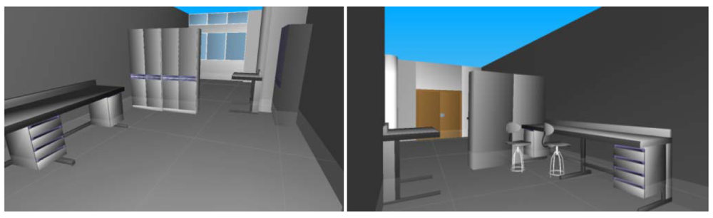 Figure 12 illustrates the basic model of a test-room obtained after all particular recognition and pose sub-processes had been carried out. Lights and shades have been introduced in the scene in order to provide a more realistic 3D model. Note also that although the scanning of the room was carried out with an open double-door (in order to facilitate the detection), the 3D model shows the door closed.
