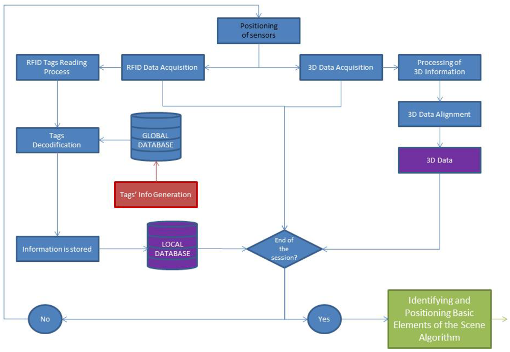 At first, the two sensors (scanner and RFID reader) are placed together in several strategic locations of the scene to cover the whole indoor environment. For each of these positions, a data acquisition process is carried out. A set of 3D points is provided by the laser scanner and at the same time, certain geometry and color information of the different elements is obtained from the tags by means of the RFID sensor.