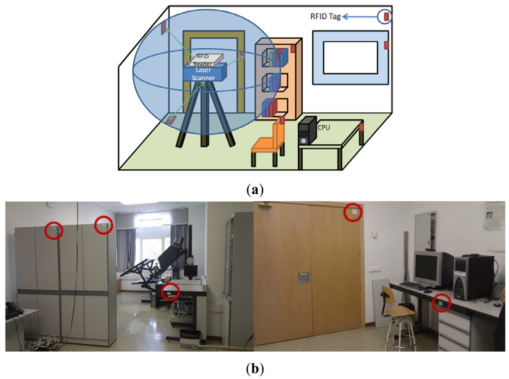 As has already been mentioned, this article proposes a solution based on the combination of two technologies of a different nature, these being laser scanners and radio frequency identification. RFID tags adhered to different objects provide valuable information about them, which makes the identification and positioning of basic elements in the scene faster and easier. In this work, we propose an innovative approach in this challenging research field. Obtaining an accurate model of an interior can be very useful in applications related with exploration, manipulation and autonomous navigation with mobile robots or vehicles. In these cases the robot needs to know the principal constructive elements of the interior, the objects in the scene and their position.