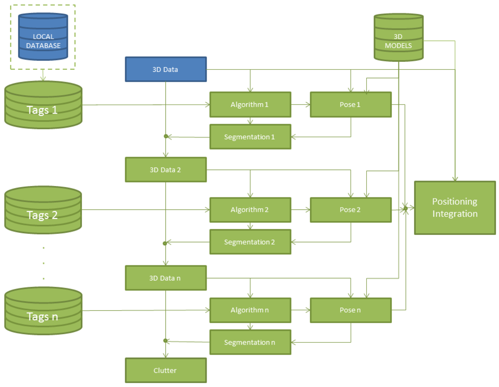 It consists of carrying out a selective and sequential identification of the elements of the scene. Each element is segmented from the cloud of points by means of a different algorithm depending on the information that the RFID tag provides. Whenever an element is identified, its pose is calculated and its corresponding 3D points are removed from the cloud of points before searching for the following element. Once the pose is calculated for each element, the corresponding 3D model is integrated in a virtual scenario. The identification sequence for the elements of an inhabited interior is the following: static elements (walls, ceiling, floor, openings in the walls and moldings) and dynamic elements (tables, closets and chairs).