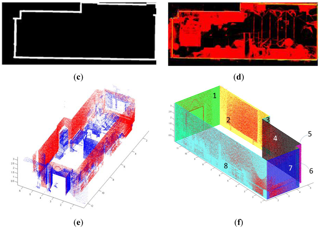 Once the walls' points are identified, the next process consists of labeling the different walls and fitting each one of them to a plane. Thus, we obtain a simplified 3D model of the room. A simple model in this context signifies a model which contains the labels, the pose and the relationship between the objects in the scene. Complex semantic models are those that include much more information like sort of material, history, physical and chemical properties. In Figure 6(e) the points corresponding to the walls are represented in red. In (f) the fitted patches are shown in different colors.