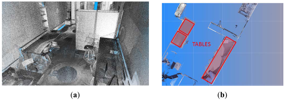 Table tag. Any type of table is characterized solely by the height and area of the top. It does not make sense to store more detailed information because, owing to the occlusion and the incomplete scanning of the scene, information concerning a part of the table's surface might not be available. Figure 4 shows an example in which part of the table is missing.